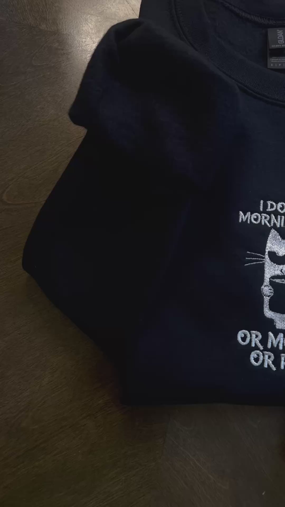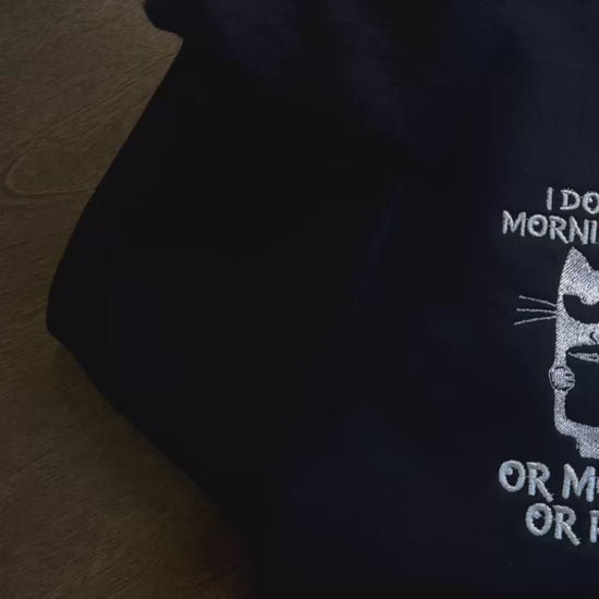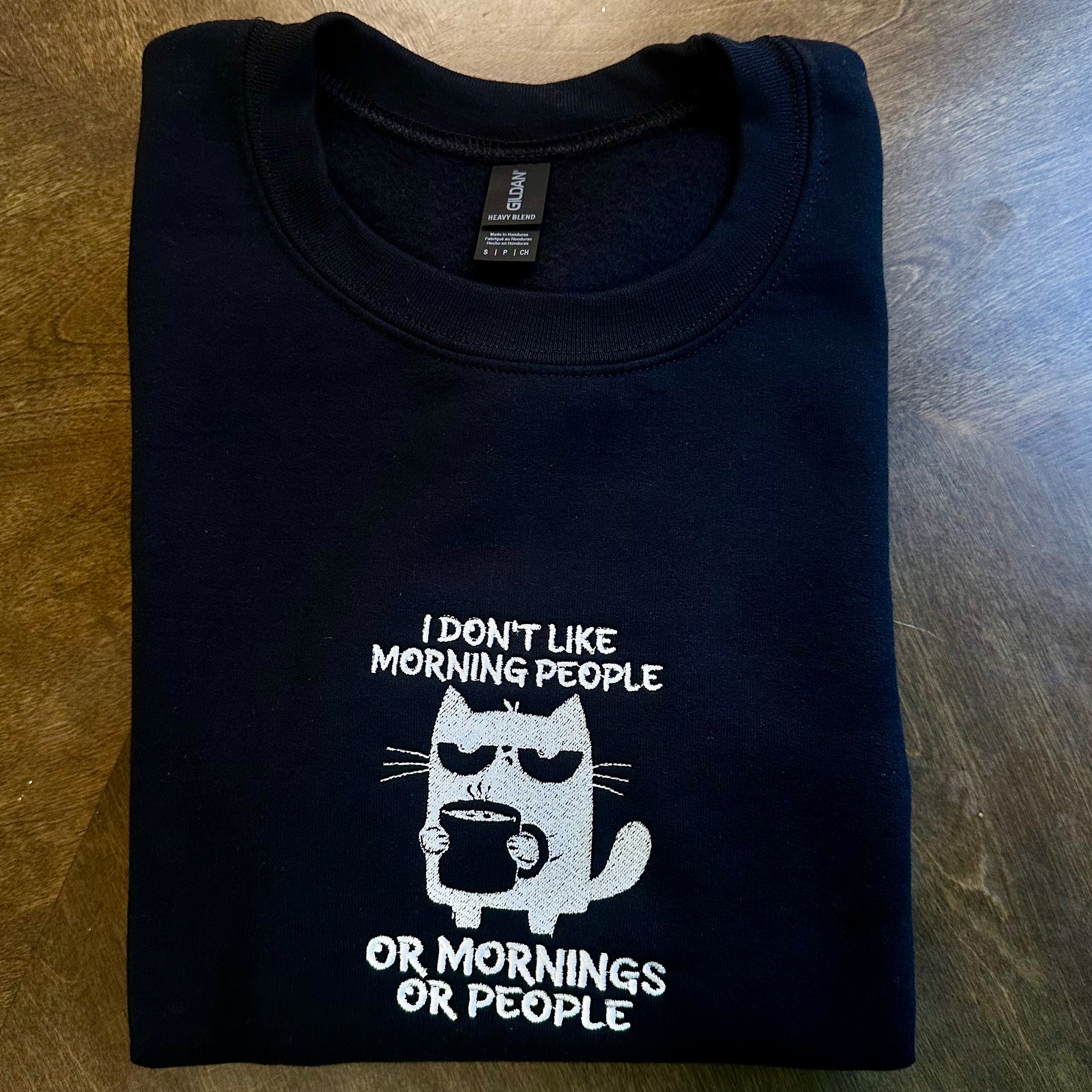 Fueled by caffeine and zero patience — this grumpy cat embroidery, coffee cup in paw, says it all: “I don’t like morning people. Or mornings. Or people.”